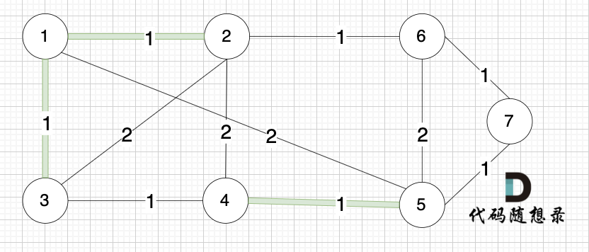 选边(5,7),节点5 和 节点7 在同一个集合,不做计算。
