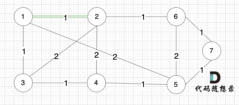 选边(1,2),节点1 和 节点2 不在同一个集合,所以生成树可以添加边(1,2),并将 节点1,节点2 放在同一个集合。