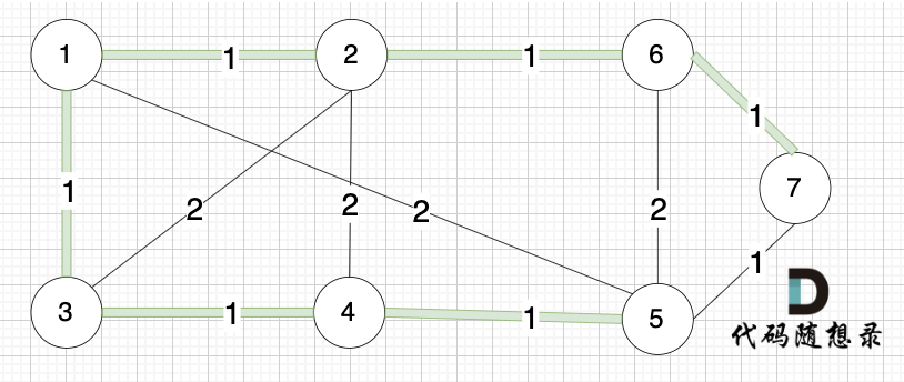 选边(6,7),节点6 和 节点7 不在同一个集合,生成树添加边(6,7),并将 节点6,节点7 放到同一个集合。