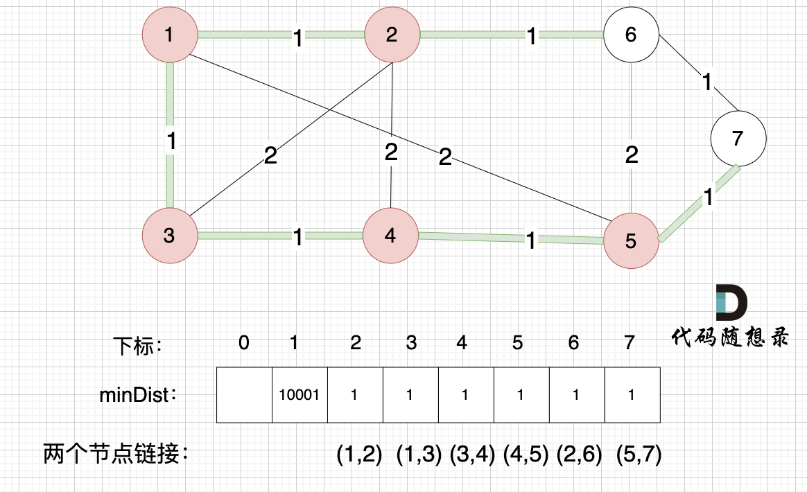 如果大家不理解,可以跟着我们下面的讲解,看minDist数组的变化,minDist数组里记录的权值对应的哪条边。