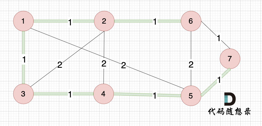 继续选距离最小生成树(节点1、节点2、节点3、节点4、节点5)最近的非生成树里的节点,只有节点6和节点7。