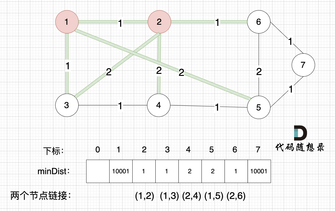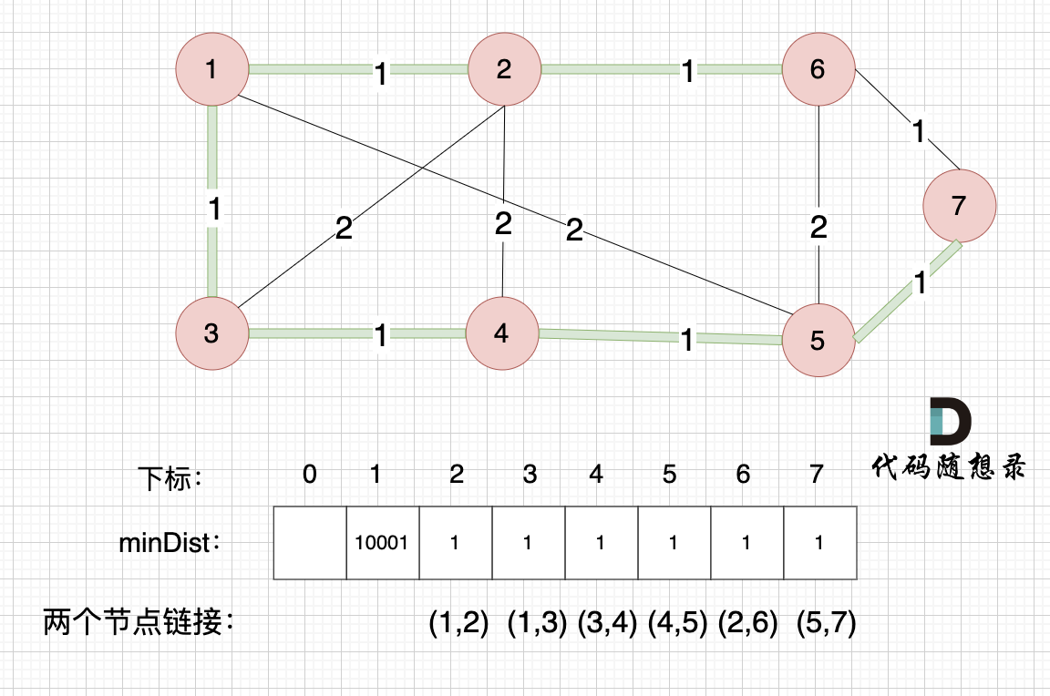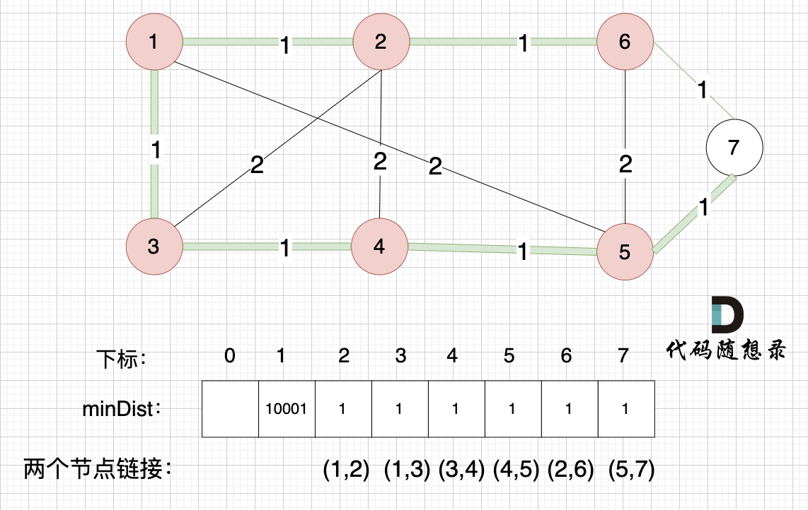 注意,我们根据minDist数组,选取距离生成树最近的节点加入生成树,那么minDist数组里记录的其实也是最小生成树的边的权值(我在图中把权值对应的是哪两个节点也标记出来了)。