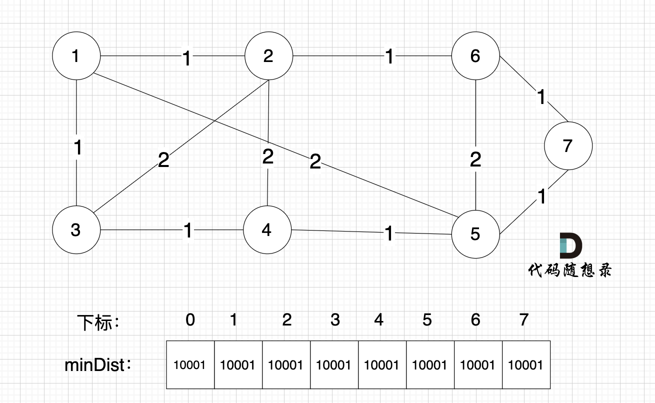 minDist数组用来记录每一个节点距离最小生成树的最近距离。理解这一点非常重要,这也是prim算法最核心要点所在,很多录友看不懂prim算法的代码,都是因为没有理解透这个数组的含义。