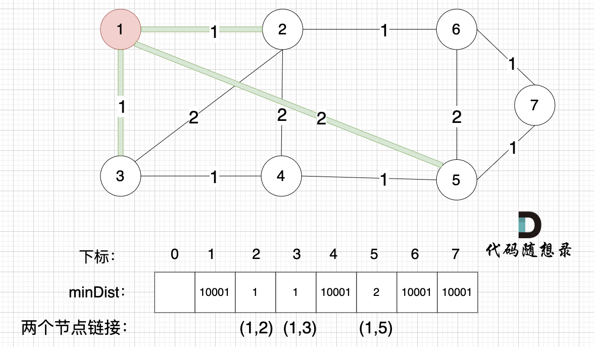 minDist数组已经更新了所有非生成树的节点距离最小生成树(节点1、节点2、节点3、节点4、节点5)的距离。