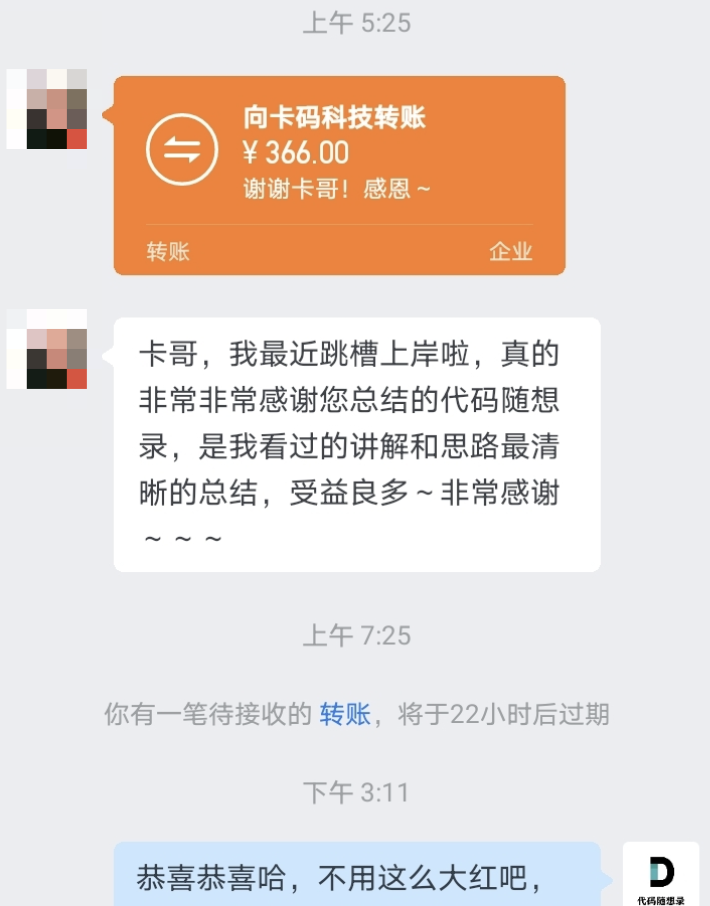 当大家通过 代码随想录 提升了编程与算法能力,考上研或者找到好工作的时候,于我来说已经是很幸福的事情: